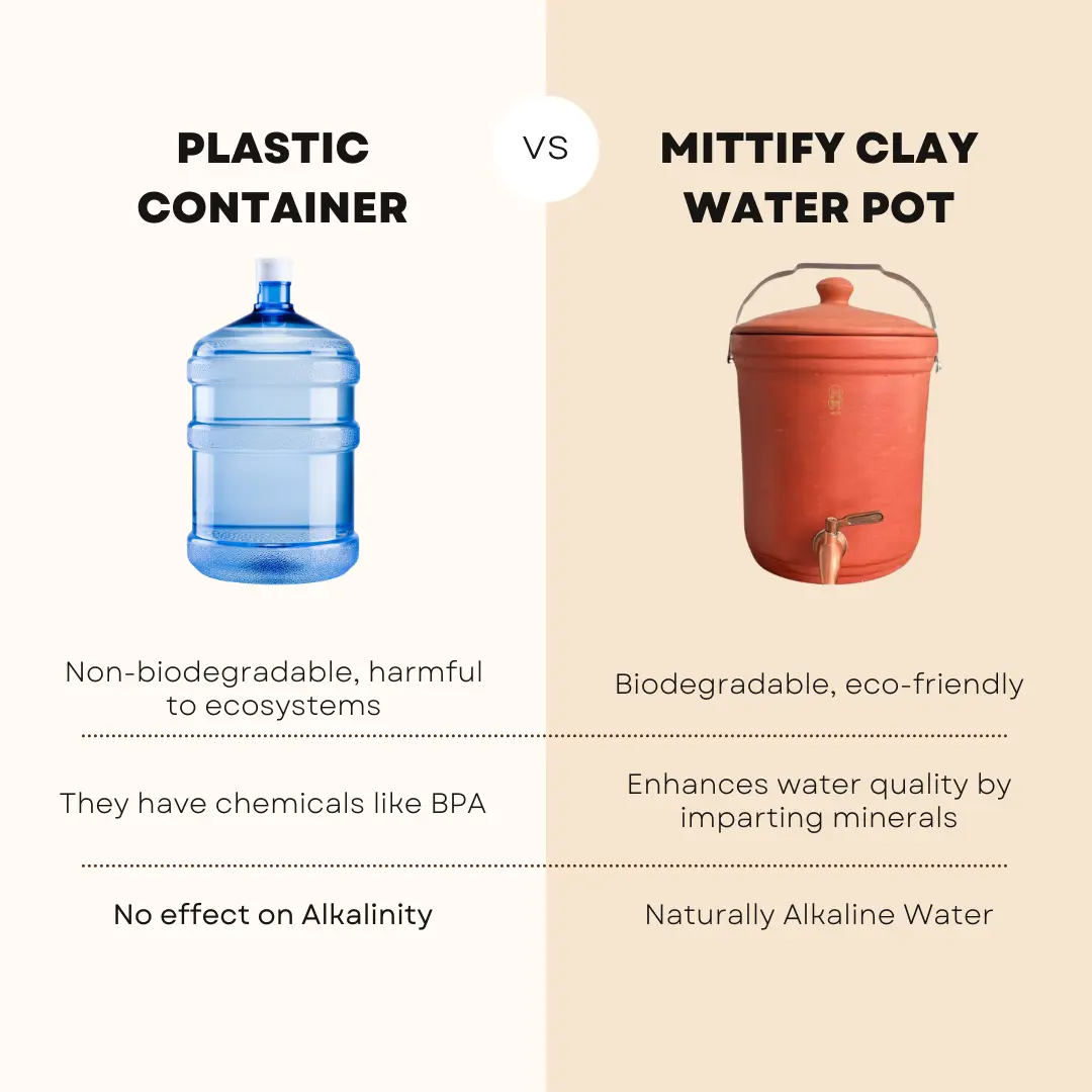 Health Benefits: It offers natural cooling and alkalinity, enriched with beneficial minerals and antimicrobial properties. By eliminating plastic exposure, it promotes a healthier lifestyle.