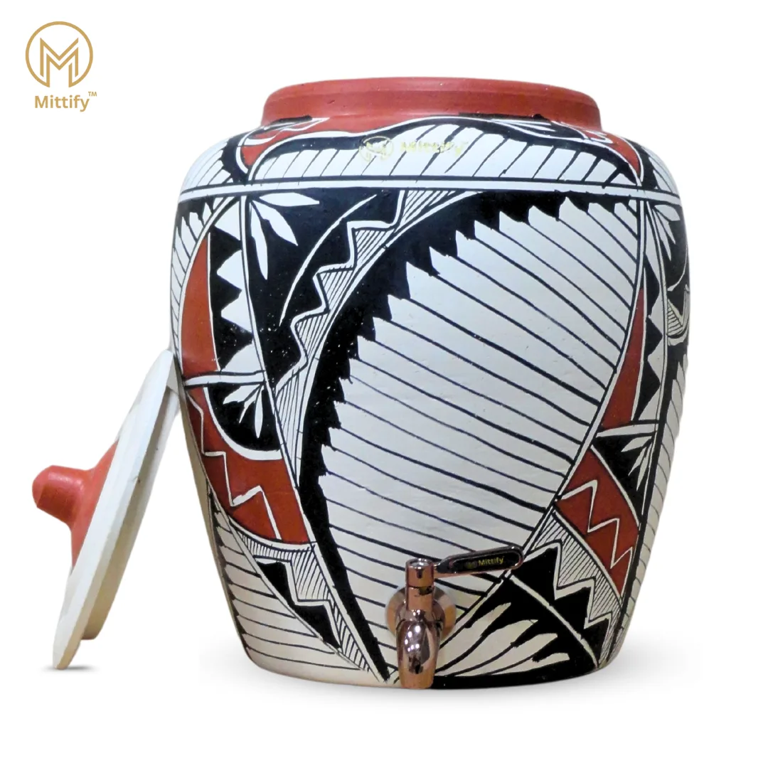 Transform your hydration habits with the Earthen White Clay Water Pot Warp Design with Metal Tap. Embrace the beauty of traditional craftsmanship, the health benefits of natural clay, and the joy of sustainable living. This mitti ka matka is more than just a water potβitβs a celebration of heritage, health, and harmony with nature.