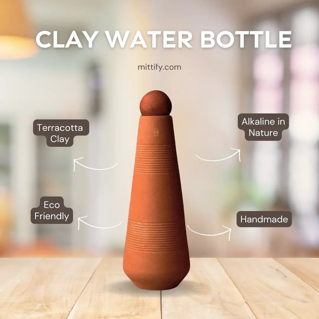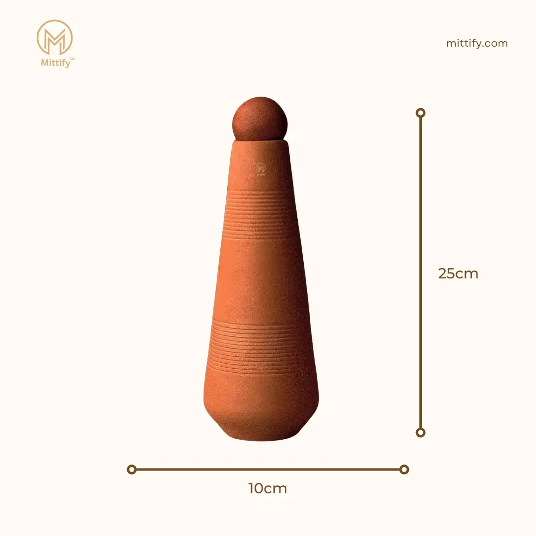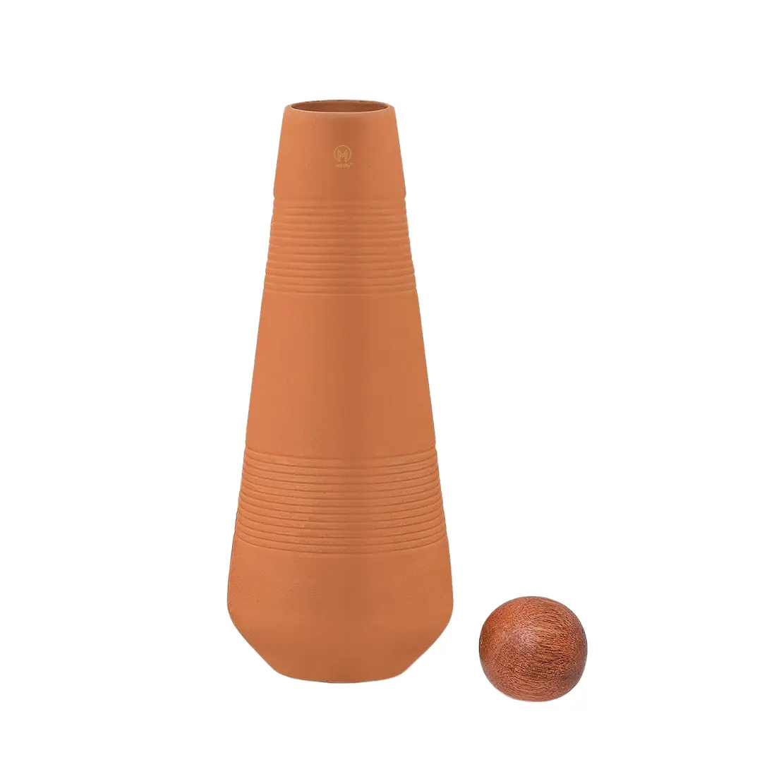 Made from premium-quality clay, this water bottle not only captivates with its rustic beauty but also enhances the purity and taste of your drinking water. The porous nature of clay naturally cools beverages, while the spherical stopper lid ensures a snug fit, keeping your water fresh and secure with every sip.