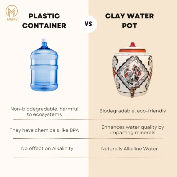 Choosing this white clay water pot means reducing your reliance on plastic bottles and synthetic containers. Mittify Clay pots are biodegradable and environmentally friendly, ensuring your water is stored in the purest, most natural way. With every use, you are taking a step toward sustainable living while reducing plastic waste and carbon footprint.