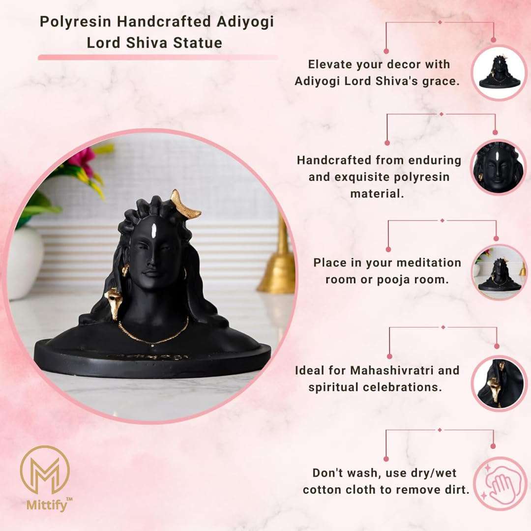 The Mittify Adiyogi Statue is a compact and intricately designed masterpiece that brings the divine presence of Lord Shiva into your everyday spaces. Standing at 5 inches tall, this beautifully crafted statue symbolizes peace, spiritual awakening, and infinite wisdom, making it an ideal addition to your car dashboard, home decor, or office table.d