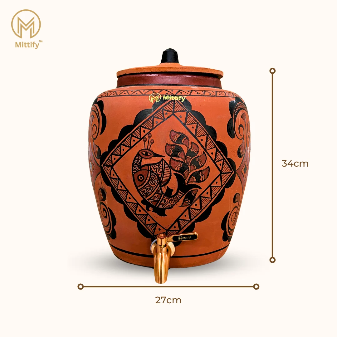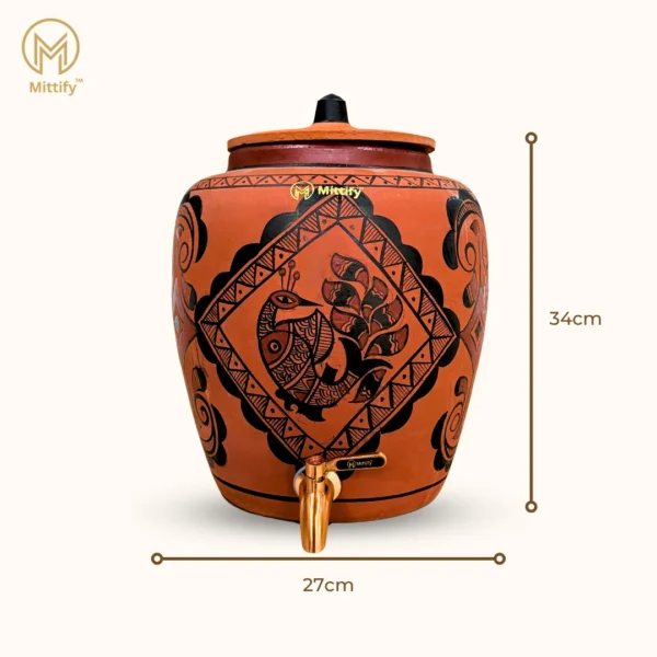 The water pot is equipped with a durable metal tap for easy dispensing and a secure clay lid to keep your water clean and safe. The metal tap is designed to provide a steady flow of water while preventing leaks, ensuring a mess-free experience. The clay lid helps maintain hygiene by protecting the water from dust and contaminants. - Eco-Friendly and Sustainable