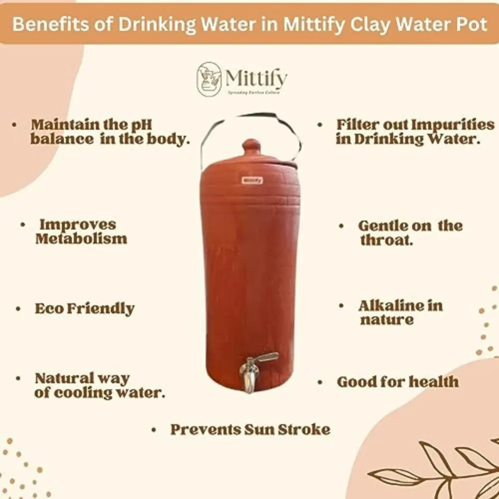 Mittify presents a stylish, strong, and lightweight clay water pot with a Stainless Steel (304 grade) metal tap that is always better than typical plastic bottles. Use this clay dispenser for everyday use and hygienically enjoy your water.